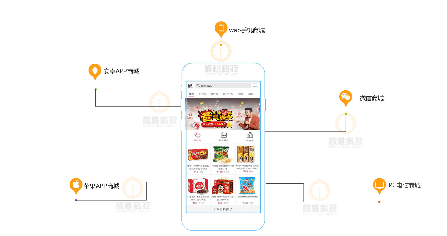 五合一商城是基于核桃科技的技術優勢,通過對公司全端開發實力的一個系統性融合,把web電腦商城、wap手機商城、微信公眾號商城、蘋果APP商城、安卓APP商城數據打通,在一個服務端實現全斷商城數據、商品、訂單等信息的統一管理統一發布,極大的降低了管理成本,同時最大化的擴展了產品的覆蓋面。