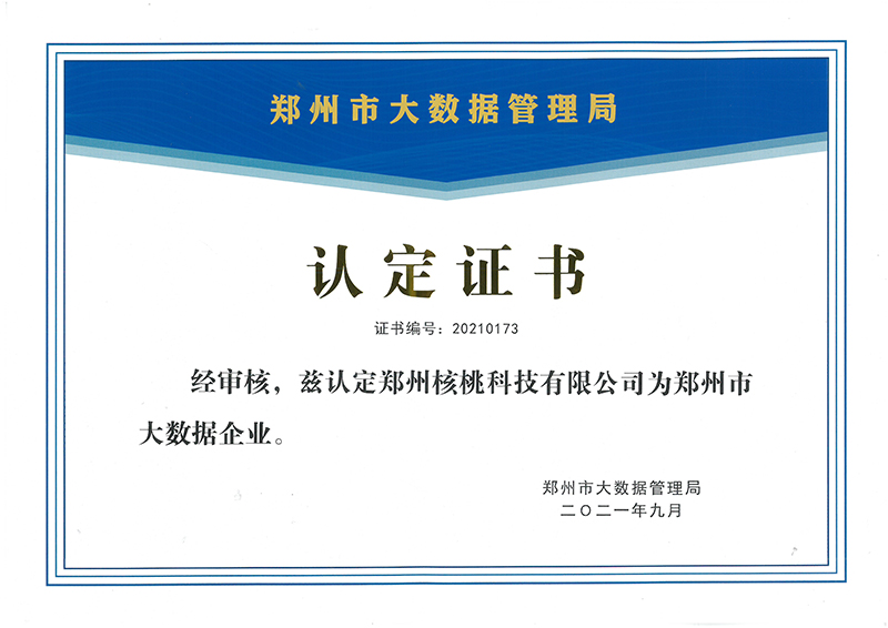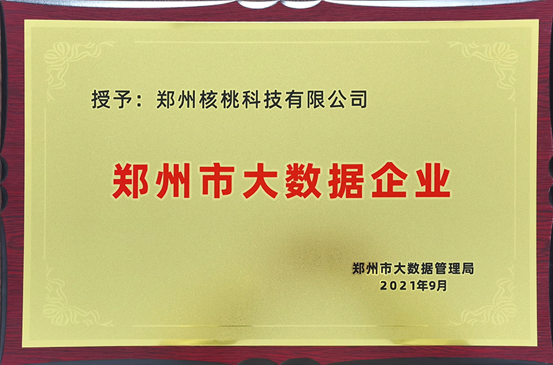 根據《2021年鄭州市大數據企業認定名單公示公告》發布的結果,鄭州核桃科技有限公司被認定為“2021年鄭州市大數據企業”。