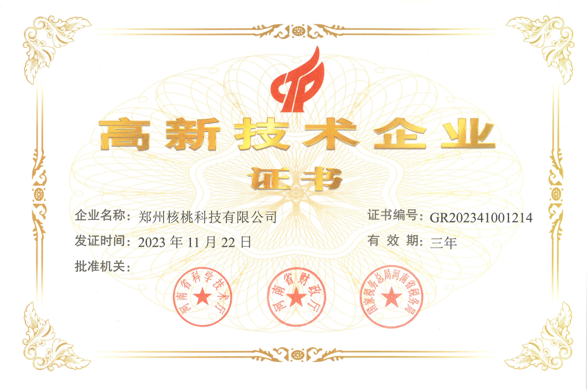 近日捷報傳來,核桃科技憑借其卓越的技術創新能力、高效的成果轉化能力以及產學研深度融合的優勢,在2023年度的國家高新技術企業復審中順利通過,再次榮獲“國家高新技術企業”稱號!