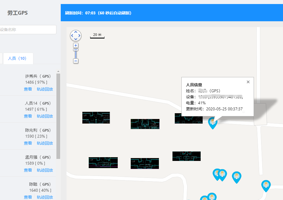 通過地圖可以查看人員當(dāng)前所在位置,點(diǎn)擊可查看人員的基本信息,設(shè)備電量信息,位置回傳時間信息。