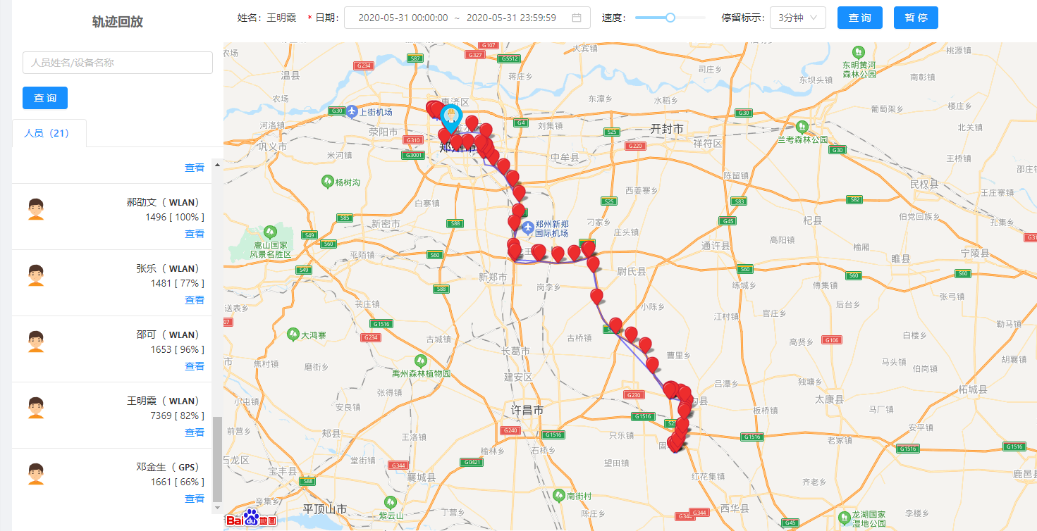 可根據(jù)人員信息,按照日期停留時間的長短形成軌跡信息,在地圖上呈現(xiàn)人員的移動軌跡。