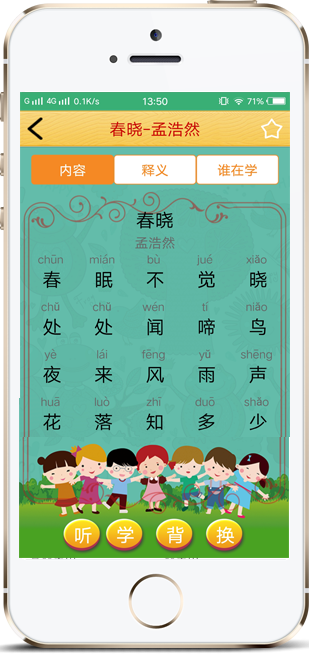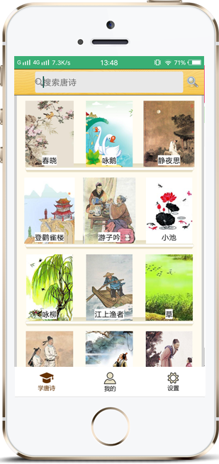 “學唐詩”運用書架的樣式,讓孩子和家長更直觀的明白怎么使用APP進行學習唐詩。